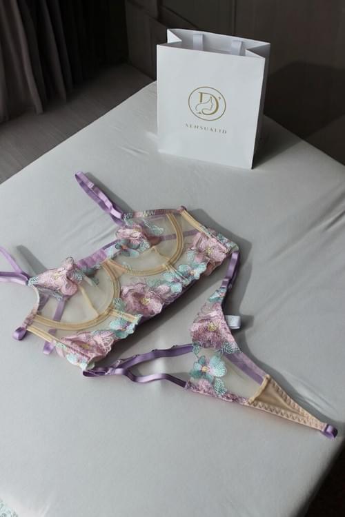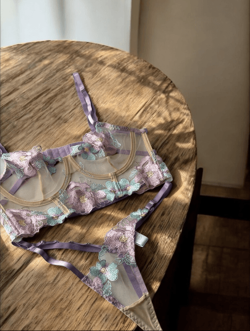 Nuestro sutil conjunto de dos piezas color lila brasier ajustable de espalda y hombros, con varilla. Panty corte semitanga ajustable de cadera.