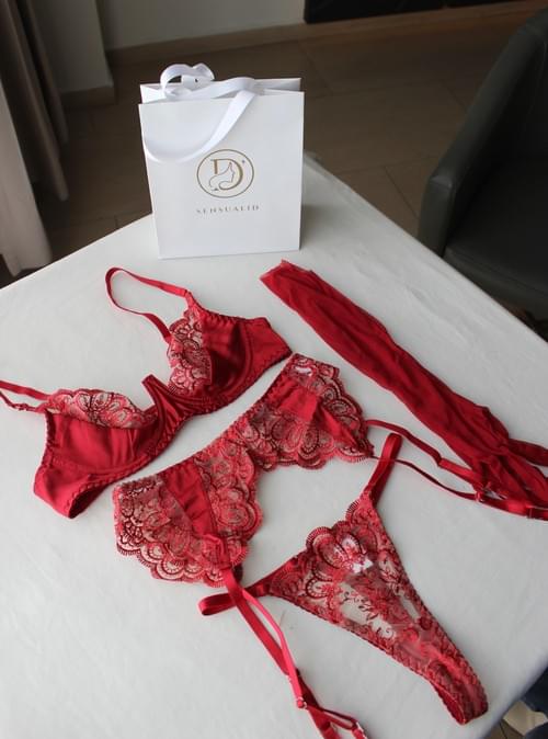 Nuestro hermoso set Daney color tinto rojizo. Incluye sujetador, tanga, cinturilla con cordones y un par de guantes largos. Corte en pecho innovador.