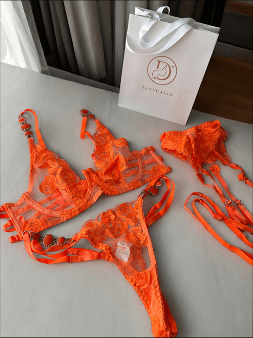Nuestro hermoso set color naranja con varilla en parte alta. Incluye sujetador, tanga, Liga y ligueros ajustables para las piernas.