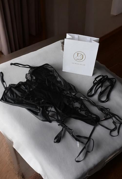 Body de cuero de látex con encaje recortado tirantes para piernas