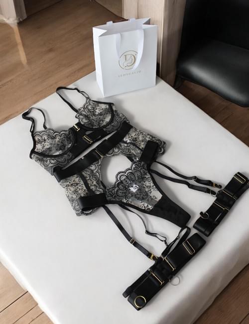 Nuestro hermoso conjunto Demi de lujo incluye sujetador, tanga, liga y tirantes para piernas.