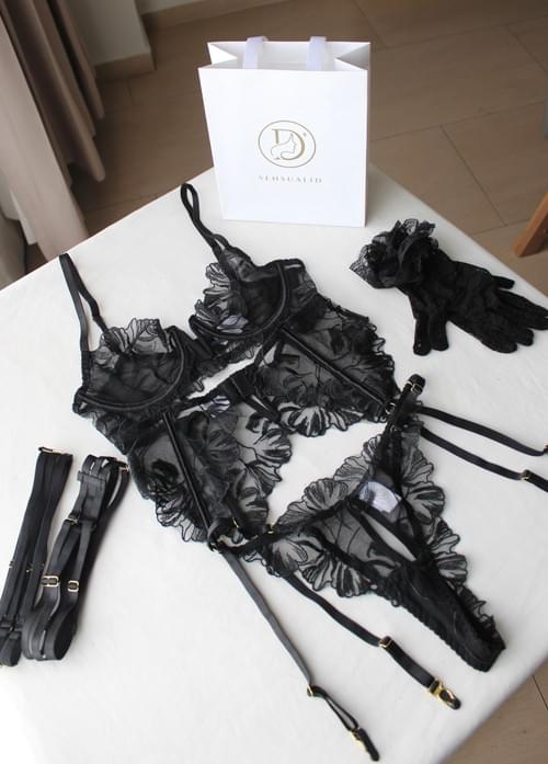 Nuestro hermoso set Donatella Negro. Incluye sujetador, tanga, liga, correas de pierna y un par de guantes. Corte en pecho innovador.