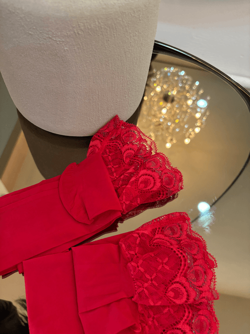 Par de medias delia rojas, delicado encaje en la parte superior y tela suave que se adapta comodamentte a tus piernas estas medias son perfectas para completar tu look con un toque sensual y elegante